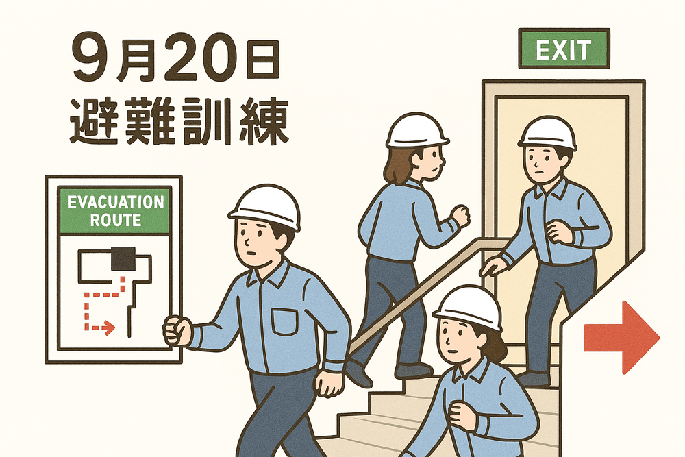 はじめての試みで少しドキドキもありましたが、社員みんなが協力し合い、無事に全員が避難完了。避難経路を示すボードも新しく設置し、「いざという時」の意識がぐっと高まったように感じます。