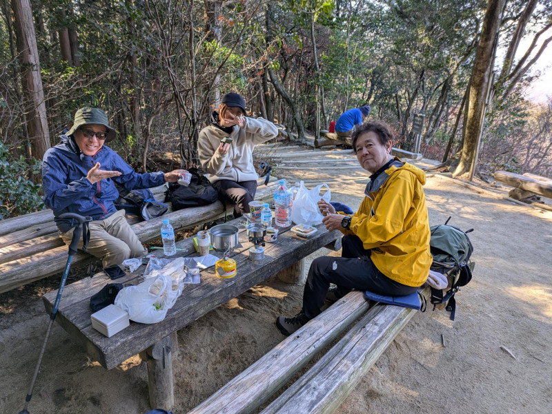 空腹を満たすランチの時間、目の前には澄み渡った空に映える白山、そして御嶽山の雄大な姿がありました。「神様はいなくても、山は我々を受け入れてくれた」——そんな感慨深い景色でした。