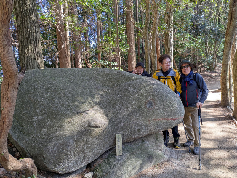 東の宮を過ぎ、山頂への道すがら現れたのは、有名な「カエル石」。我々も「無事に帰る」ことをその巨岩に願い、最後の登りへ挑みます。